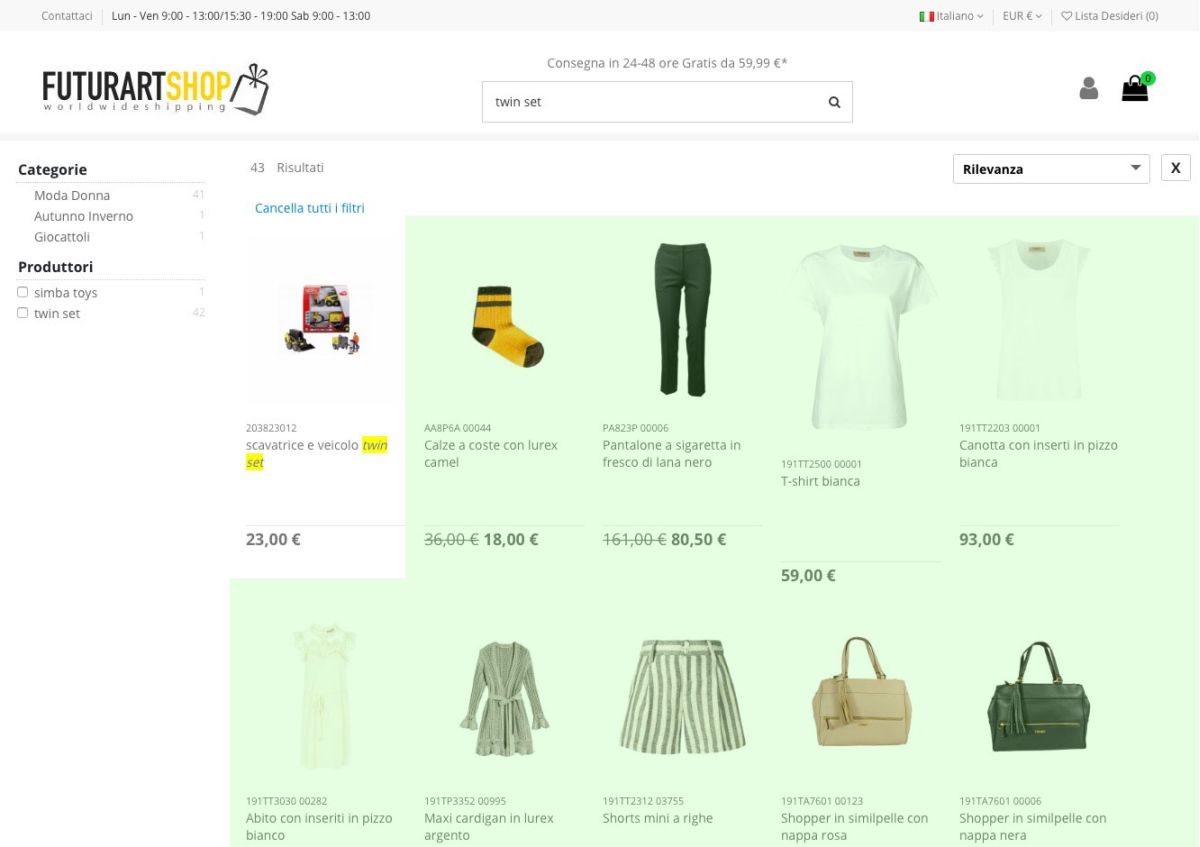 Scrivendo il nome del produttore “Twin-set” prima il motore di ricerca restituiva solo 1 prodotto, ovvero dove la keyword risultava presente nel titolo. Ora, dopo la modifica dell’algoritmo, vengono restituiti tutti i prodotti che fanno parte del produttore “twin-set” anche senza l’utilizzo di alcun filtro. Vedi screenshot a seguire.