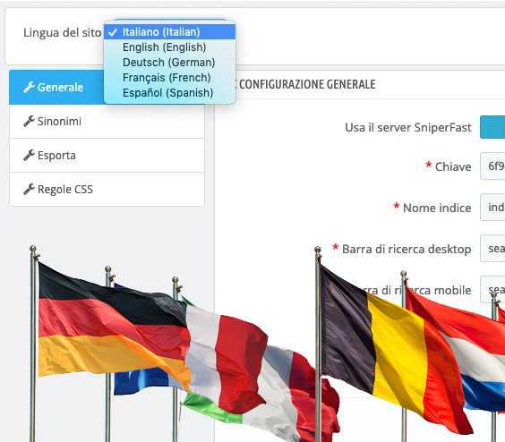 SniperFast consente di gestire siti multilingua generando risultati dedicati per lingua con configurazioni dedicate.