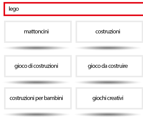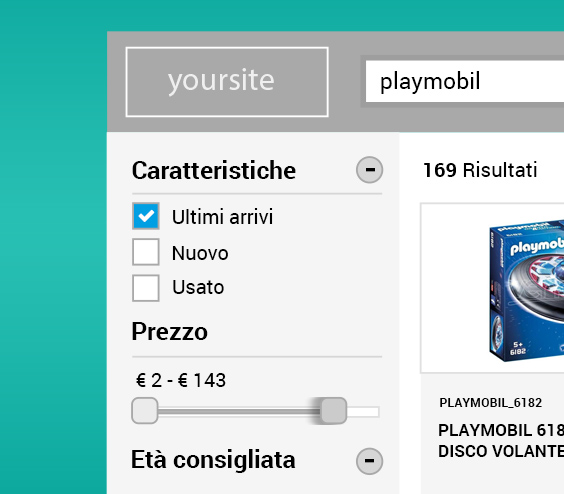 Grazie alla gestione dei sinonimi se gli utenti non digitano correttamente il nome o usano un termine molto generico è possibile personalizzare il risultato. Ad esempio, se digitano “mattoncini”,”costruzioni”, ecc il sito presenterebbe prodotti “Lego” e viceversa.